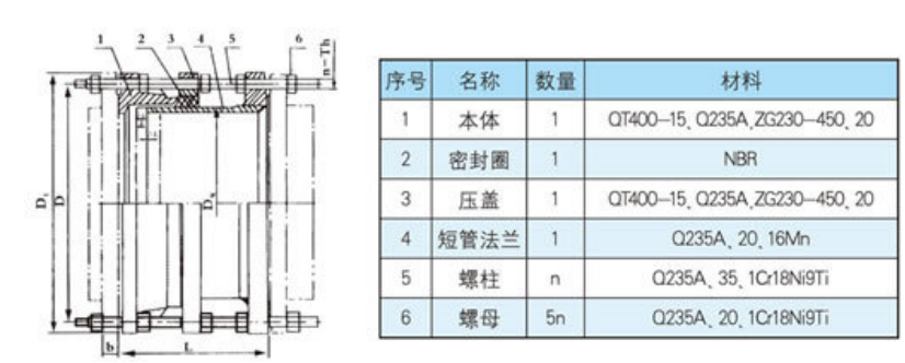 可拆卸接頭是由本體、密封圈、壓蓋、伸縮短管等主要部件組成。適用于兩邊均與法蘭連接的管道中,安裝時(shí)調(diào)節(jié)產(chǎn)品兩端與法蘭的安裝長(zhǎng)度,對(duì)角集資均勻擰緊壓蓋螺栓,使其成為以整體,并有一定的位移量,方便安裝維修時(shí),根據(jù)現(xiàn)場(chǎng)尺寸進(jìn)行調(diào)整。在工作時(shí)可以反軸向推力傳遞至整個(gè)管道。優(yōu)點(diǎn):安裝簡(jiǎn)單方便、方便閥門(mén)安裝。在法蘭松套補(bǔ)償接頭的基礎(chǔ)上增設(shè)法蘭短管及傳力螺桿而成,次類(lèi)型的補(bǔ)償接頭與松套補(bǔ)償接頭和松套限位補(bǔ)償接頭不同的是它的補(bǔ)償量是指在安裝及拆卸過(guò)程中的調(diào)節(jié)量,一旦將所有的螺母擰緊,它是剛性連接的,可以傳遞軸心力,從而保護(hù)閥門(mén)、泵等設(shè)備。